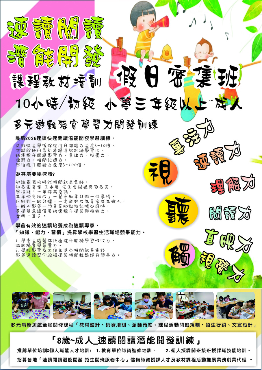 招募各地「速讀閱讀潛能開發 招生開班服務中心」儲備師資授課人才及教材課程活動推展業務創業代理 。
